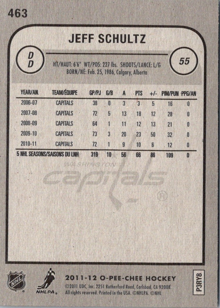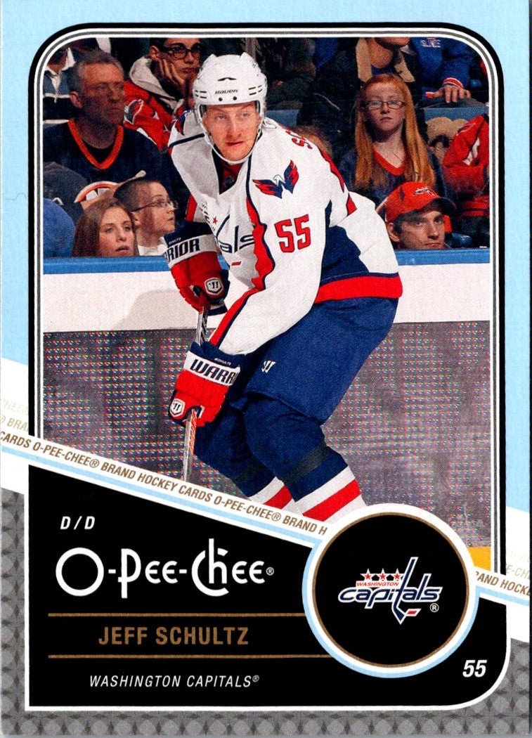 Jeff Schultz is a great addition to any Washington Capitals fan's collection. This 2011 O-Pee-Chee card features Schultz in his full Capitals glory, looking fierce in his blue and white uniform. The front of the card shows Schultz in a defensive stance, ready to make an impact on the ice. On the back, you can read up on Jeff's career stats and his history with the team. With this card, you can honor one of the Capitals' best defensemen and add a great piece to your collection.