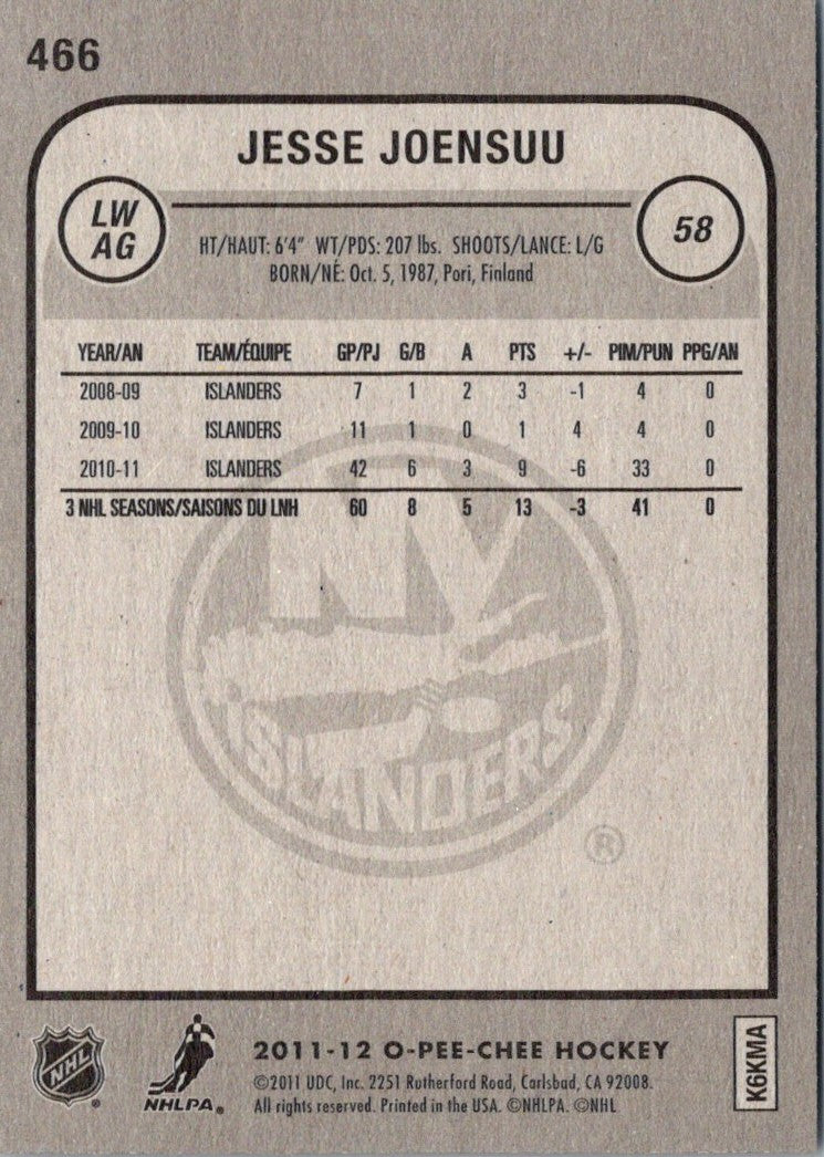 This 2011 O-Pee-Chee Jesse Joensuu #466New York Islanders card is the perfect way to show your support for your favorite team. Featuring an action shot of Joensuu in his Islanders uniform, this card is sure to look great in any collection. It's colorful graphics and high quality craftsmanship make it a great addition to any Islanders fan's collection. Plus, with its affordable price, you can add this card to your collection without breaking the bank.