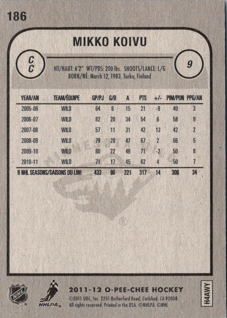 This 2011 O-Pee-Chee Mikko Koivu #9 Minnesota Wild card is a must have for any hockey fan! The card features a great action shot of Koivu, showcasing his amazing skating abilities. The card is printed on high-quality card stock, making it a great item to add to any collection. It is also a great way to show pride in the Minnesota Wild and their star forward!