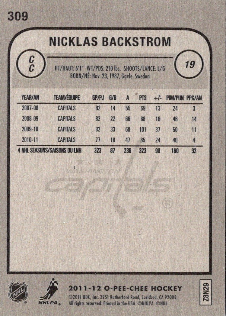 This 2011 O-Pee-Chee Nicklas Backstrom #309 is the perfect addition to any Washington Capitals fan's collection. Show your support for one of the greatest players of the modern NHL era with this iconic card featuring a color portrait of Backstrom in a Capitals uniform. The card is in near-mint condition and makes a great gift for any Capitals fan. Don't miss out on this great item!
