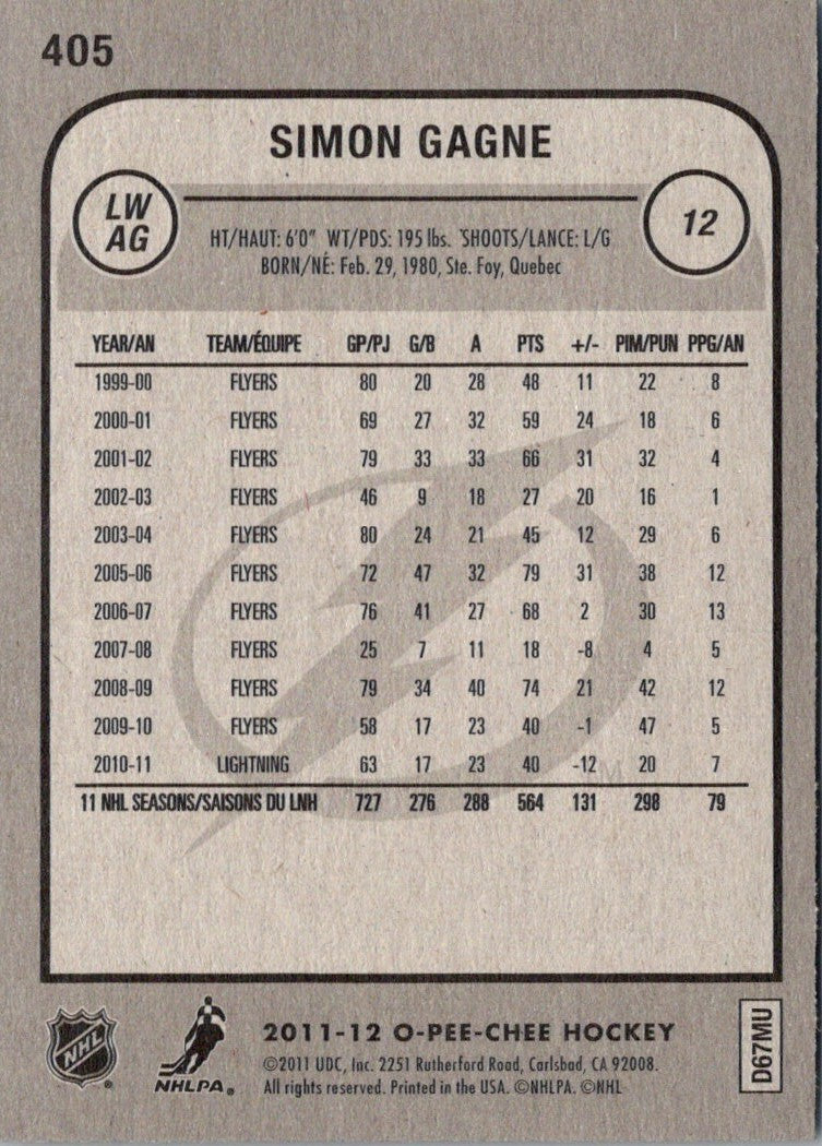 Simon Gagne's 2011 O-Pee-Chee card captures him in a Tampa Bay Lightning uniform, with a stunning action shot that shows off his intensity on the ice. This card features a full-color photo of Gagne in his dynamic Lightning jersey, with an up-to-date stats and career highlights section on the back. This card is a great way to add a piece of Gagne's hockey history to your collection!