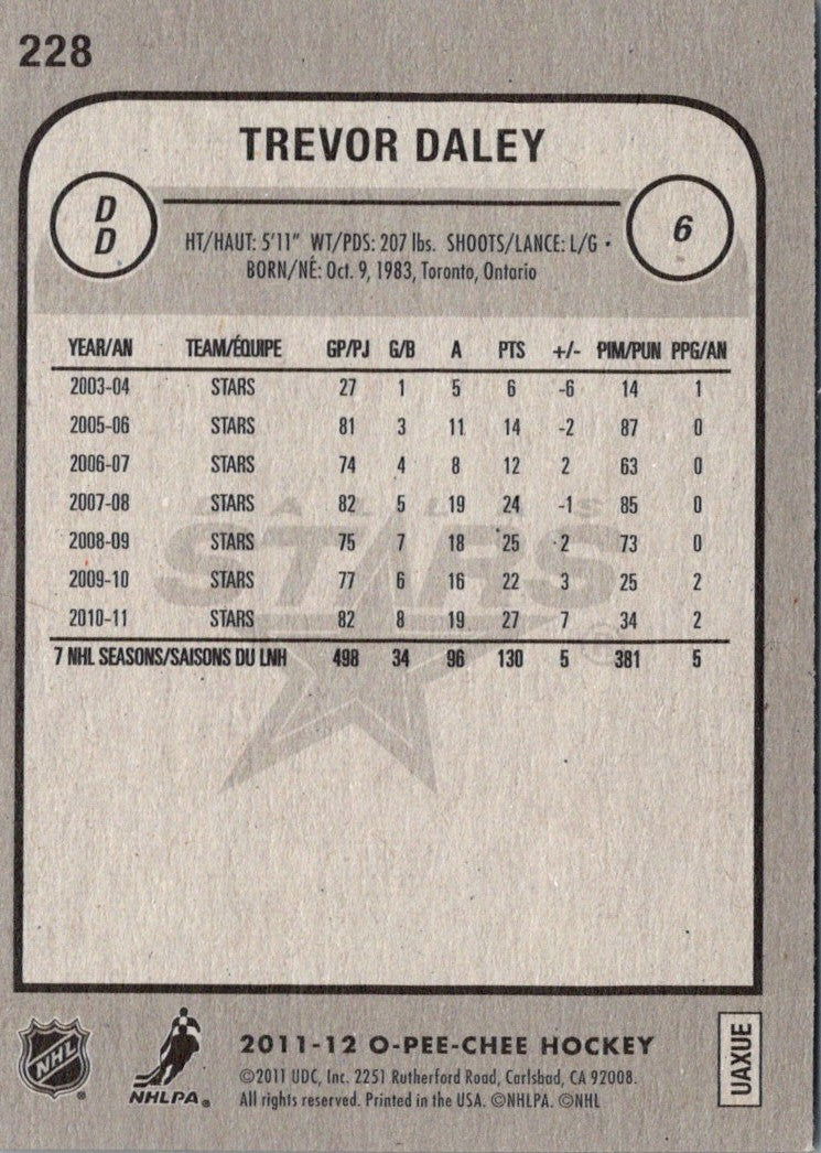 This 2011 O-Pee-Chee Trevor Daley #228 Dallas Stars card is a must-have for any hockey card collector. This card features a full-color, glossy image of the player on the front, along with the team logo and year of issue. The back of the card features a detailed player bio, stats, and other information. This card is a great way to show your support for the Dallas Stars and to commemorate the career of Trevor Daley. Add this card to your collection today and show your pride in the Dallas Stars!