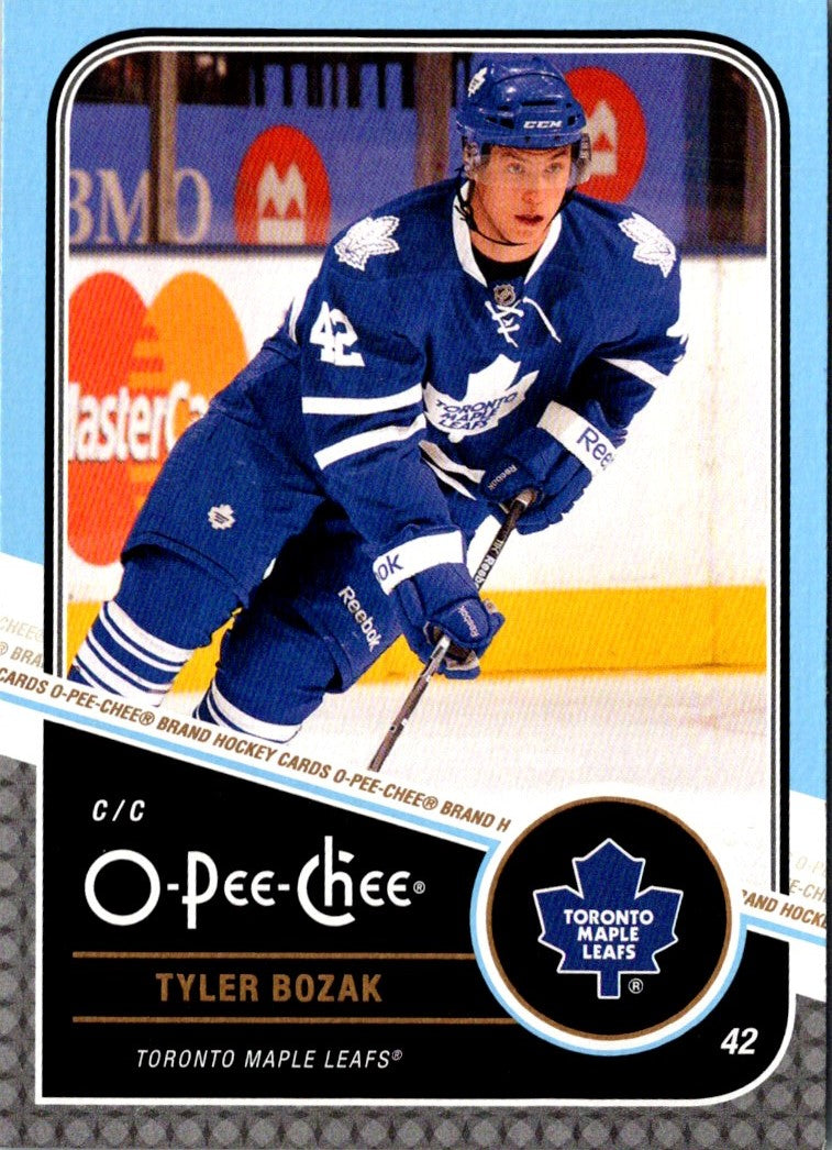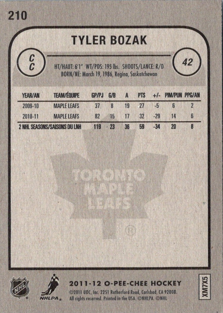 This 2011 O-Pee-Chee Tyler Bozak #210 Toronto Maple Leafs card celebrates the career of one of the best Leafs players in recent history. This card features a crisp, vibrant image of Bozak in his Maple Leafs jersey, as well as detailed stats and other information about the player. This card is a must-have for any Leafs fan and a great addition to any hockey card collection.