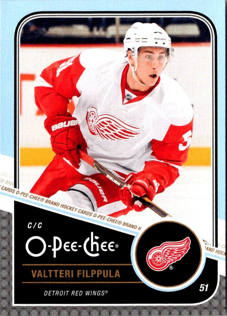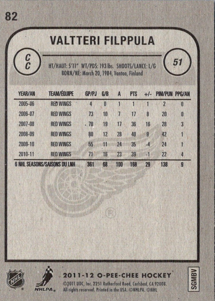 The 2011 O-Pee-Chee Valtteri Filppula #82 Detroit Red Wings card is a must-have for any fan of hockey and the Detroit Red Wings. This officially licensed card features a high-resolution image of Valtteri Filppula in his Red Wings jersey, with vibrant colors and crisp details. This card is a great addition to any hockey fan's collection. Show your support for your favorite team and player with this classic piece of hockey memorabilia. Get your 2011 O-Pee-Chee Valtteri Filppula #82 Detroit Red Wings card today!