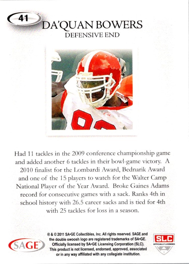 The 2011 SAGE HIT Da'Quan Bowers #41 Clemson Tigers Football Card is a must-have for any Clemson fan! The card features a color action shot of Da'Quan Bowers in his Tigers uniform, and is sure to be a great addition to any collection. This card is printed on high-quality cardstock and is in mint condition, so you can be sure that it will look great for years to come. Add this card to your collection and show your Clemson pride!