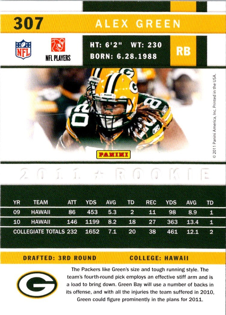 The 2011 Score Alex Green #307 Green Bay Packers trading card is an essential piece of memorabilia for any Packers fan and collector. This card features a full-color action shot of the running back in a Green Bay uniform, ready to take on the competition and make a big play. The back of the card features a detailed biography of Green, listing his stats and accomplishments with the Pack. Show your support for the Pack and add this card to your collection today!