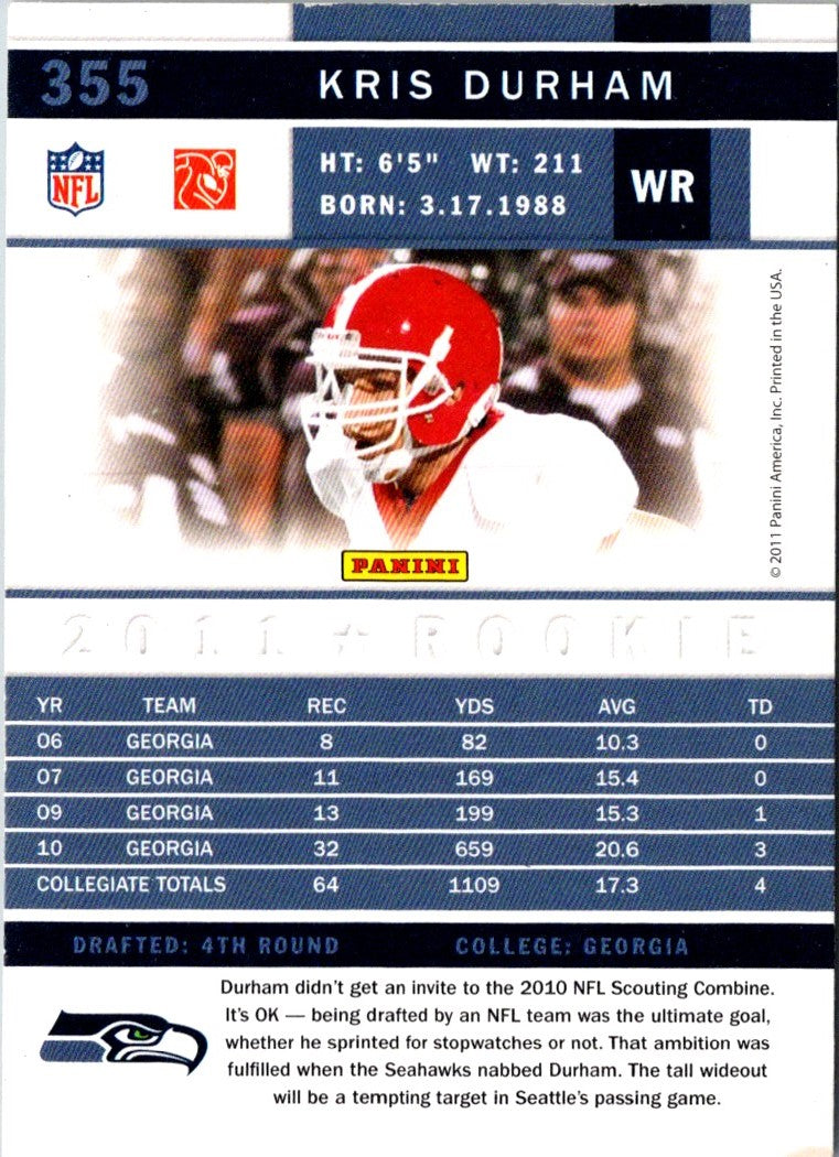 The 2011 Score Kris Durham #355 Seattle Seahawks card is a must-have for any Seahawks fan! This card features amazing graphics and adds a unique touch to any collection. With vibrant colors and crisp details, this card is the perfect way to show your support for the Seattle Seahawks. Whether you're a fan of Kris Durham or just a fan of great football cards, this is the card for you! Add this card to your collection today and celebrate the Seattle Seahawks with style.