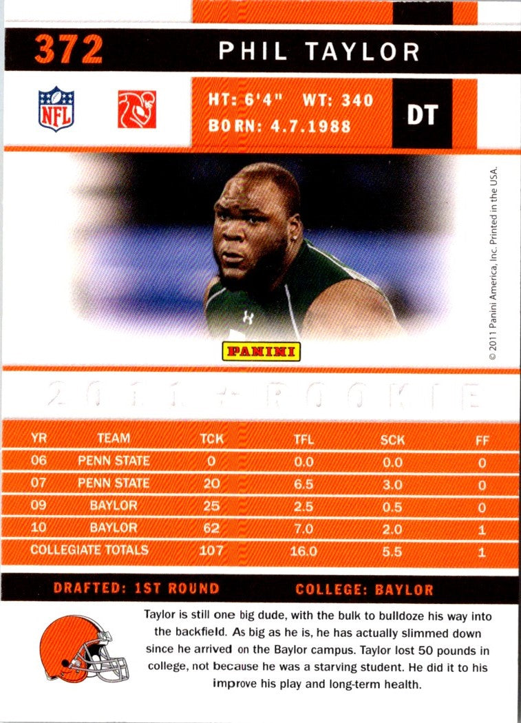 This 2011 Score Phil Taylor #372 Cleveland Browns card is a must-have for any serious football card collector. Featuring a glossy image of the player, this card is sure to add a nice touch to your football card collection. The card also features a detailed bio of the player, so you can learn more about Taylor's career and accomplishments. Perfect for any Browns fan, this card is sure to be a great addition to your collection.