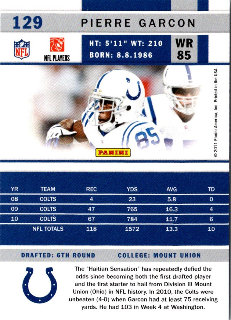 Pierre Garcon is a 2011 Score Indianapolis Colts card featuring the star wide receiver. This offering is a must-have for any Colts fan or a collector of NFL memorabilia. The card features a glossy finish on both sides with a headshot of Garcon on the front, and his stats on the back. The crisp, clean design makes this card a great piece to add to any collection. Add this card to your collection today and show your support for the Colts.