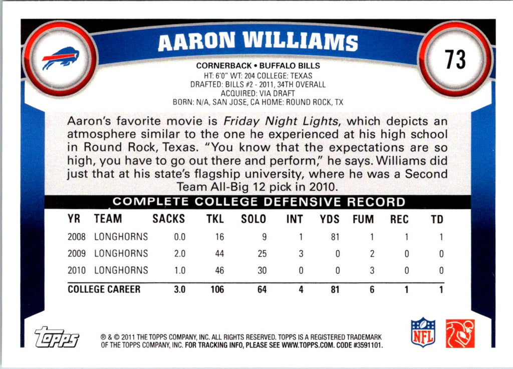This 2011 Topps Aaron Williams #73 Buffalo Bills card features the cornerback in mid-action as he comes up to make the stop. Williams has been a standout player for the Bills since being drafted in 2011, and this card is a great way to honor his career. The card is printed on high-quality card stock and features the official Topps logo. Add this card to your collection and show your support for one of the league's top cornerbacks.