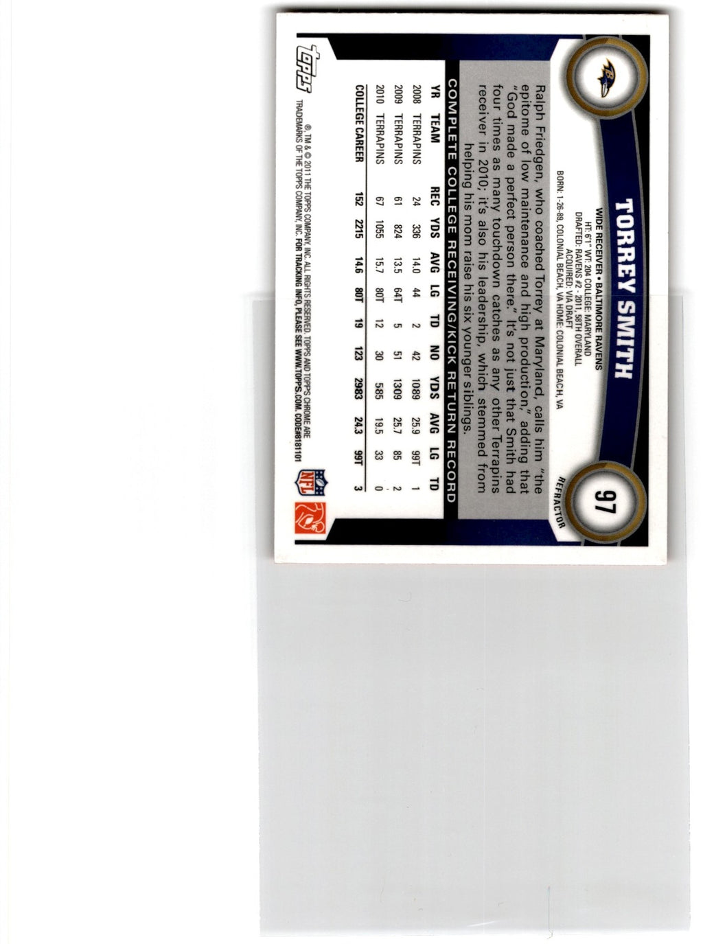 This 2011 Topps Chrome Torrey Smith #97 Baltimore Ravens card is a great addition to any football fan's collection. Crafted with durable, high quality materials, this card is sure to be a timeless collectible. It features a vivid image of Torrey Smith, and will make an excellent addition to any collection. The card is also a great piece to commemorate the 2011 NFL season and the great performance of Torrey Smith. It's a must-have for any Baltimore Ravens fan!