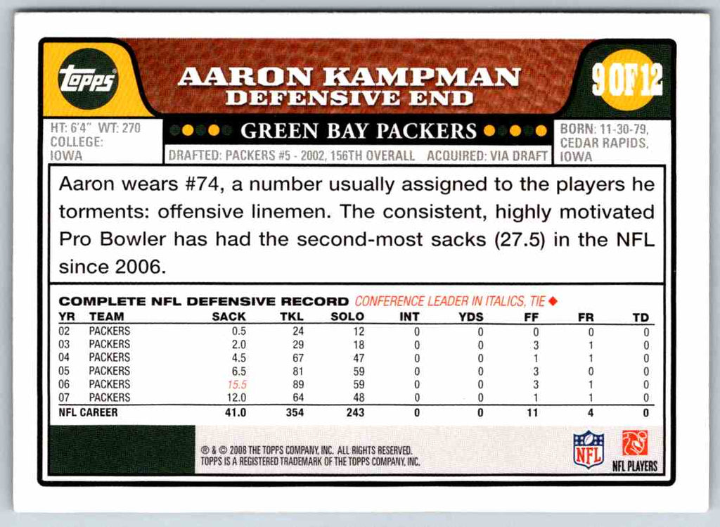 This 2011 Topps Football Aaron Kampman #9 OF 12 card features a glossy finish and a full-color action shot of the legendary Green Bay Packers defensive end. It showcases his career stats on the back and is a great addition to any football fan's collection. This card is sure to bring back memories and provide a nostalgic look back at one of the most talented defensive players of his era. Add it to your collection today and own a piece of football history!