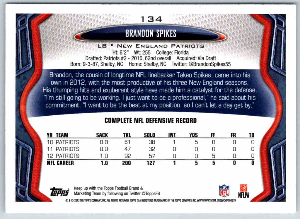 Add the 2011 Topps Football Brandon Spikes #134 card to your collection today! This card features a full-color photo of the New England Patriots linebacker in action on the field. The card also includes a detailed breakdown of Spikes' performance stats from the 2011 season, so you can easily track his progress. Whether you're a fan of the Patriots or a collector of football cards, this is a must-have item for your collection. Get it now and show your support for Brandon Spikes!