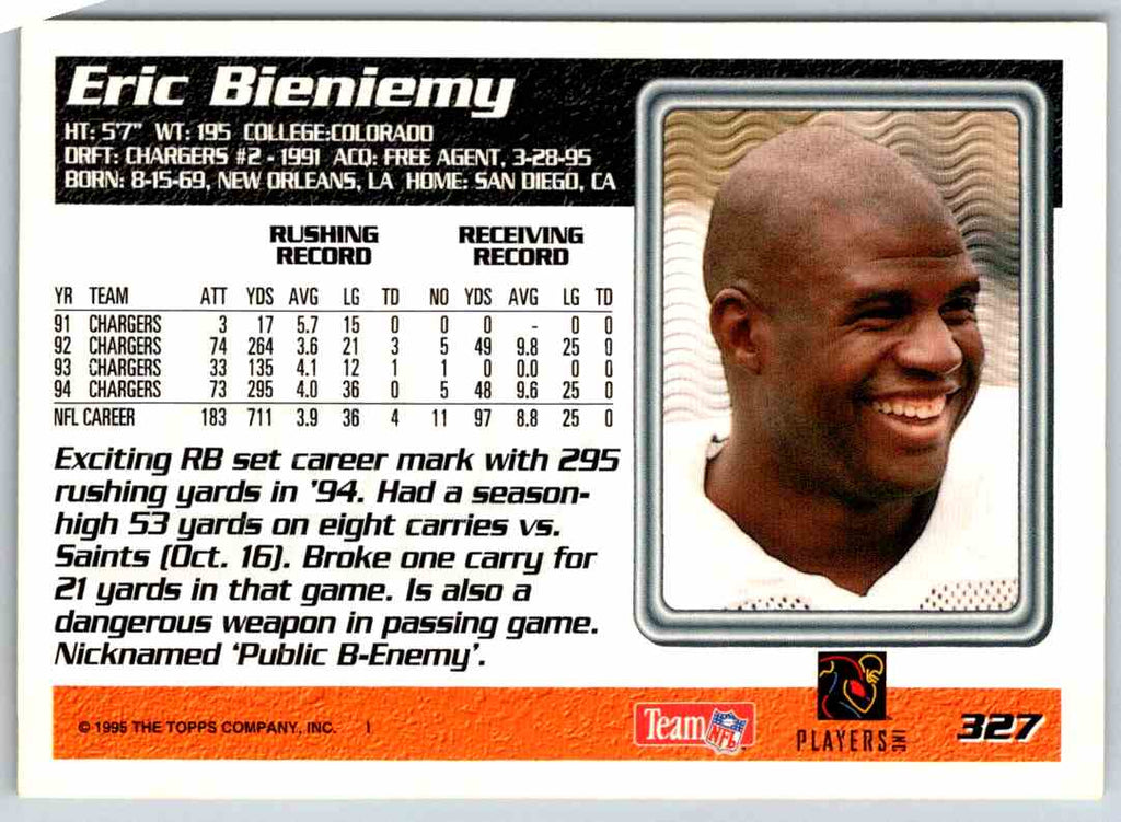 This 2011 Topps Football card of Eric Bieniemy is the perfect addition to any football fan's collection! Featuring the former NFL running back and current offensive coordinator of the Kansas City Chiefs, this card is a must-have for any fan of the game. The card is in mint condition and features a glossy finish for a high-quality look. With a bold and vibrant design, this card is sure to stand out and make a great addition to any collection!