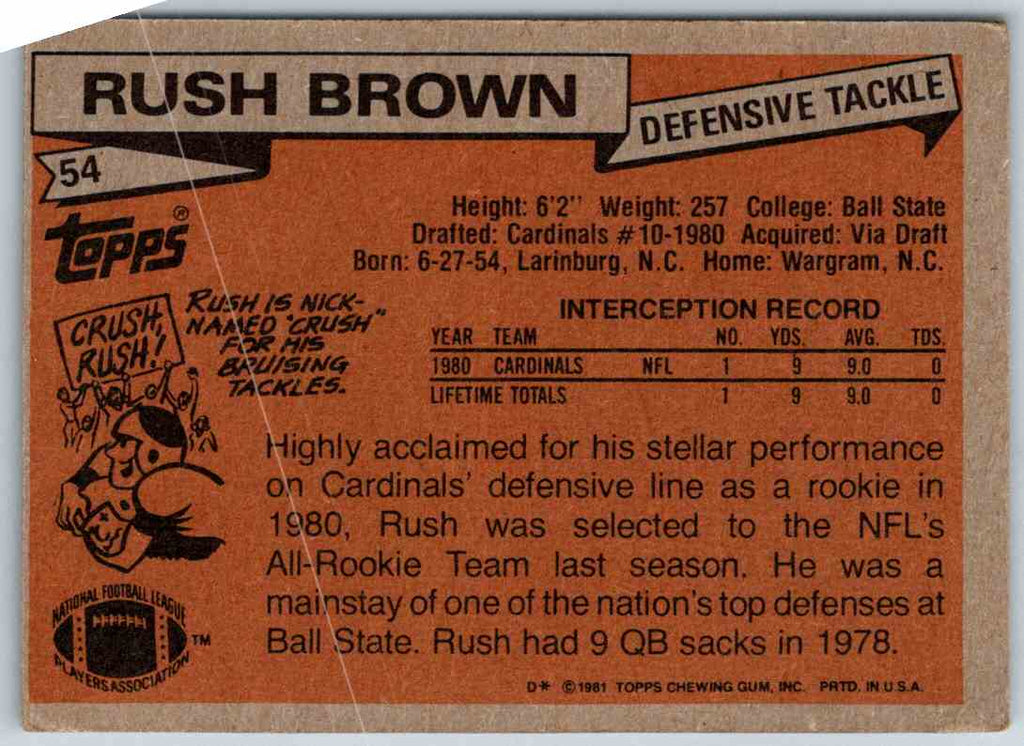 The 2011 Topps Football Rush Brown #54 is a must-have for any serious collector. This card features a bold, vibrant image of running back Mike Brown, showcasing his athleticism and explosiveness. As one of the most respected players in the NFL, this card is a great way to honor and remember his accomplishments. With its sharp edges and vibrant colors, this card will look great when displayed in any collection. Whether you're a fan of Brown or just love collecting football cards, this card is a must-have for any collector.