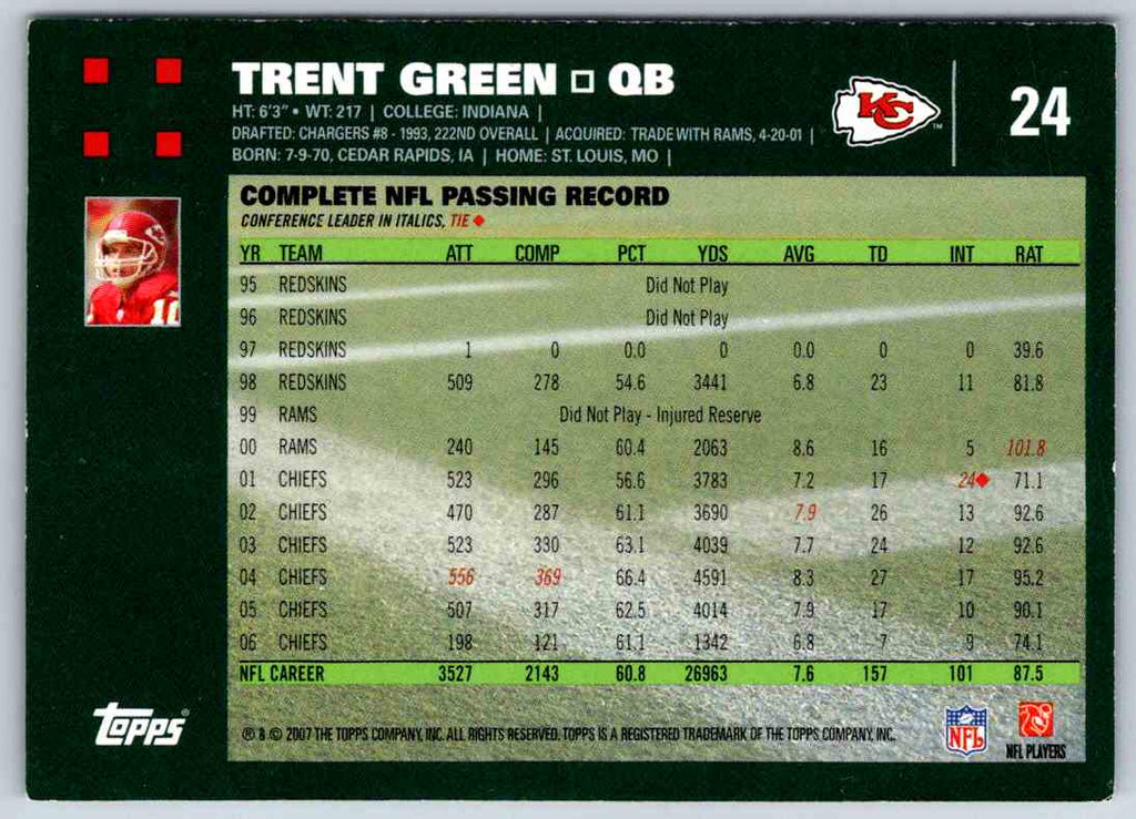 The 2011 Topps Football Trent Green #24 is a must-have for any football fan. This card features a glossy finish and a full-color portrait of the former NFL quarterback. The back of the card contains a detailed profile of Green's career, along with a statistical summary of his accomplishments. This card is a great way to honor one of the greatest players of the game. Add it to your collection today and show your support for the legendary Trent Green!
