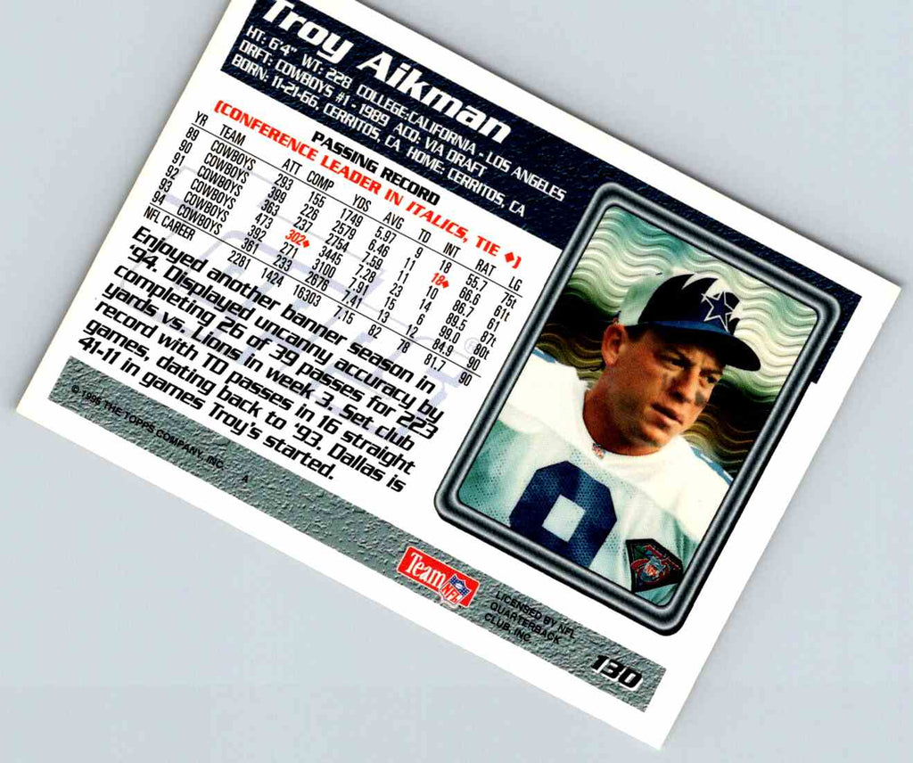 The 2011 Topps Football Troy Aikman #130 is a must-have for any fan of the Hall of Fame quarterback. This card features an action shot of Aikman in his signature blue and white Cowboys jersey, along with his name and team logo. The back of the card features a detailed biography, stats and awards. This card is a great addition to any collection and is sure to be a prized possession.