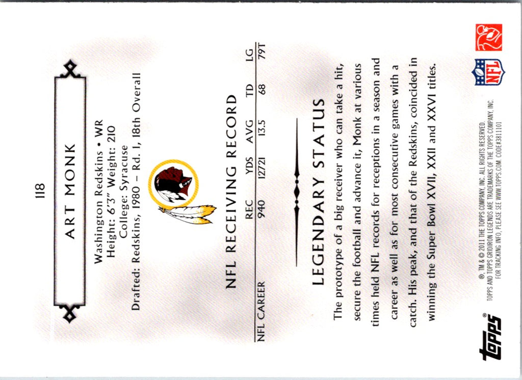 This 2011 Topps Gridiron Legends Art Monk #118 Washington Redskins card is a must-have for any fan or collector. Featuring a classic vintage design, the card features stunning imagery of the Hall of Fame wide receiver. Admire the gridiron legend in action, as the card captures Monk's unique style of play. Whether you're completing your collection, or want to show off your Redskins pride, this card is a must-have. Add it to your collection today!