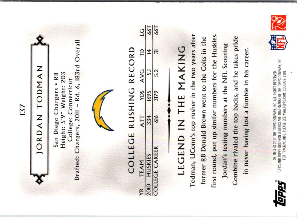 Description: 2011 Topps Gridiron Legends Jordan Todman #137 Rookie