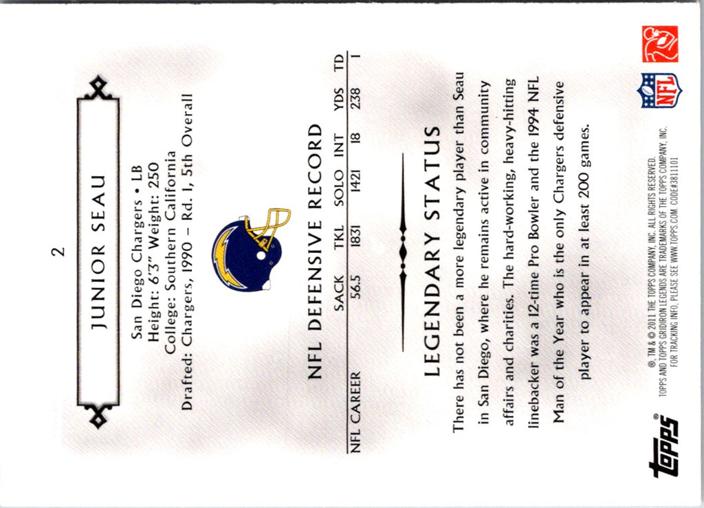 The 2011 Topps Gridiron Legends Junior Seau #2 San Diego Chargers card is a must-have for any football fan. As the leader of the San Diego Chargers, Seau was one of the most beloved players of his era. This card captures the essence of his career, with a beautiful colorized image of the Pro Football Hall of Famer in his classic Chargers uniform. It's a great way to honor one of the all-time greats, and a perfect addition to your collection.
