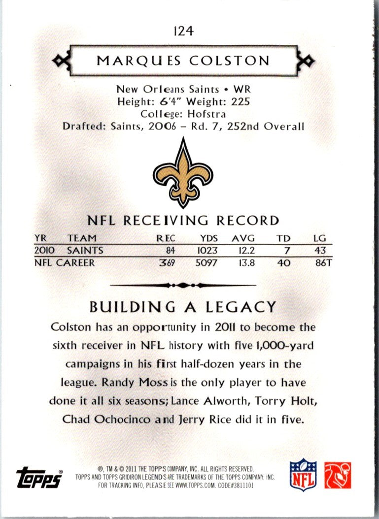 The 2011 Topps Gridiron Legends Marques Colston #124 New Orleans Saints card is a must-have for any football fan. Featuring Colston in his iconic Saints jersey, the card captures the wide receiver in action and is a great way to show your support for the team. The card is printed on high-quality cardboard and features a glossy finish for enhanced durability and a vibrant look. It's the perfect way to commemorate Colston's storied career and to add to your collection. Get your 2011 Topps Gridiron Legends Marques Colston #124 New Orleans Saints card today!