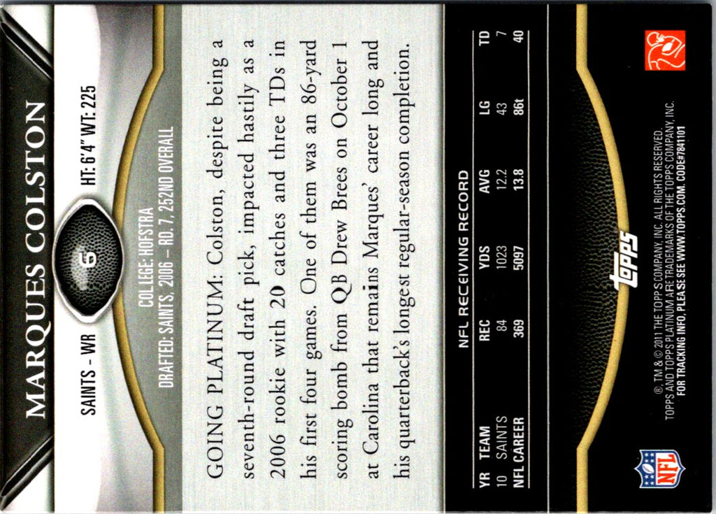 The 2011 Topps Platinum Marques Colston #6 New Orleans Saints card features a glossy finish and bold graphics of Colston in action. This card celebrates the greatness of one of the greatest wide receivers in Saints history. It is a must-have for any Saints fan or collector, and a great addition to any card collection. Show your Saints pride by adding this card to your collection!
