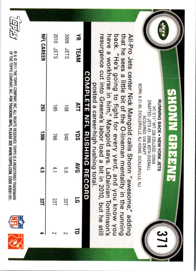 The 2011 Topps Shonn Greene #371 New York Jets card is a must-have for any Jets fan. Featuring a stunning image of Shonn Greene in his classic Jets uniform, the card captures the intensity of the gridiron. With stats and team logos showcased on the card, you can relive all the excitement of a Jets game. Show your support for the Jets by adding this card to your collection today.