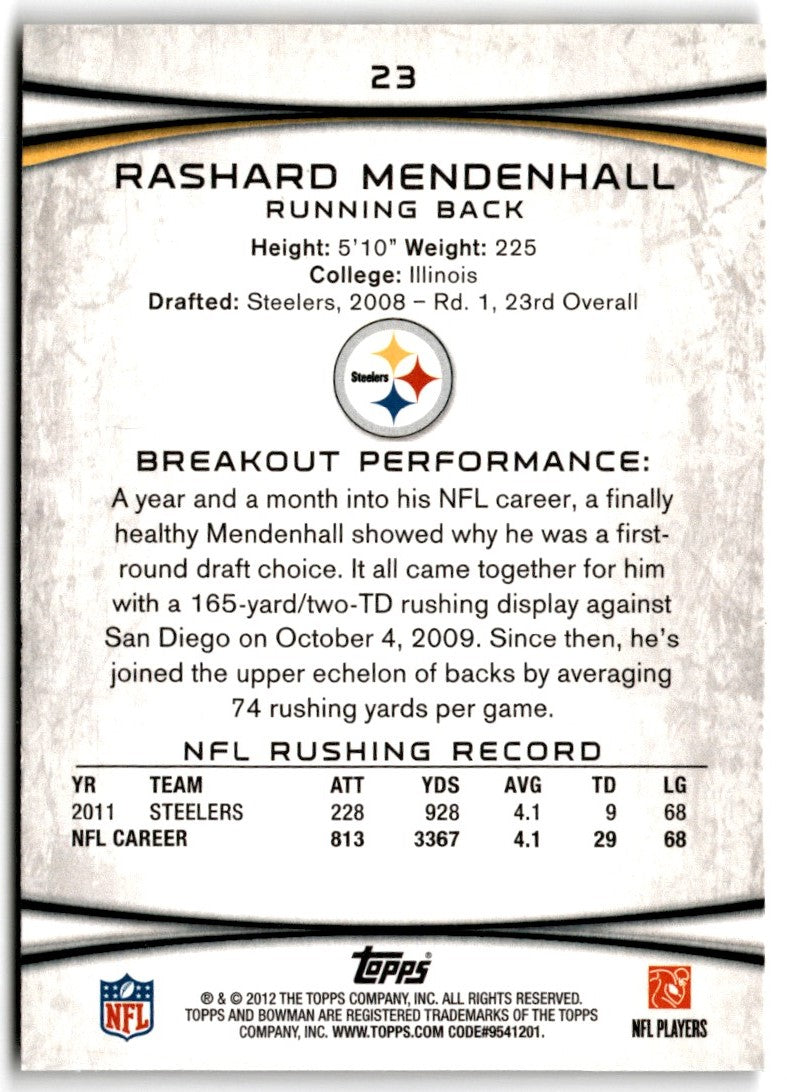 This 2012 Bowman Rashard Mendenhall #23 card is a must-have for any Pittsburgh Steelers fan. Featuring a beautiful action shot of Mendenhall on the field, this card commemorates the running back's time with the team. Show your support for the Steelers with this great card, which is perfect for any fan's collection.