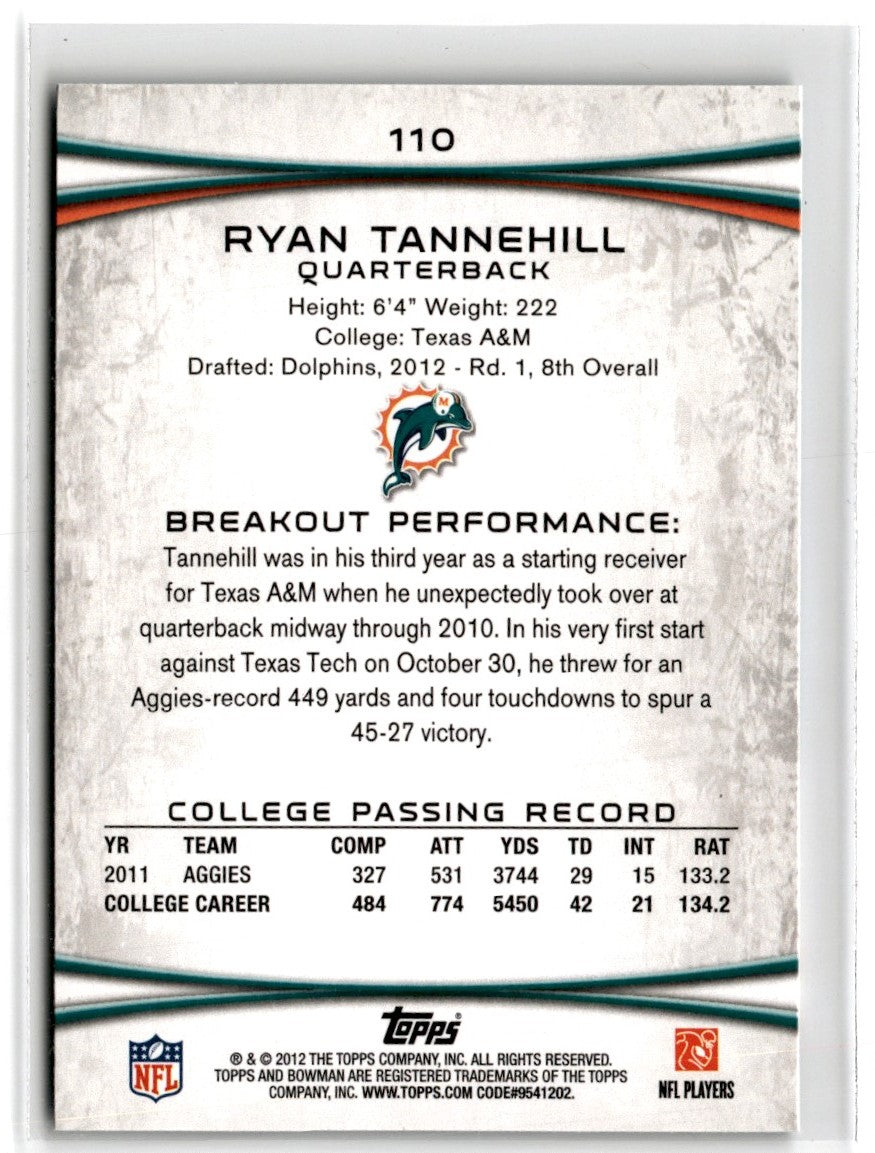 The 2012 Bowman Rookies Ryan Tannehill #110 card from Miami Dolphins is a must-have for any collector. Show your support for your favorite NFL team with this card featuring the quarterback's action shot. This card captures Ryan Tannehill's unique stance and is the perfect addition to any collection. Show your team spirit and add this card to your collection today!