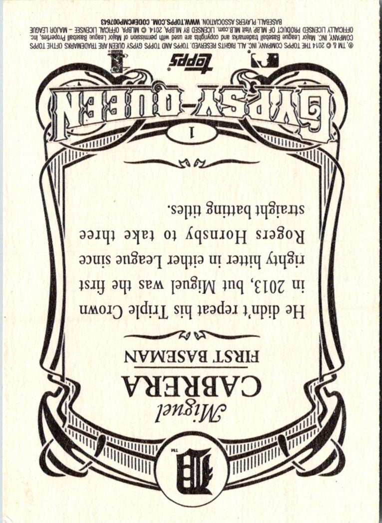 Introducing the 2012 Gypsy Kings Miguel Cabrera #1 Detroit Tigers baseball card! This is an essential piece of memorabilia for any Detroit Tigers fan. This card features a stunning image of Miguel Cabrera in his iconic white and navy blue uniform, with a bold gold and white backdrop. This card is perfect for any collector, from the casual fan to the die-hard enthusiast. Show your team pride and take home this iconic piece of sports history today!