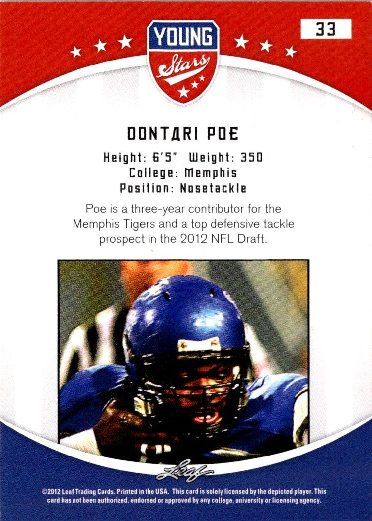 This 2012 Leaf Young Stars Dontari Poe #33 Memphis Tigers is the perfect item for any football fan or collector. It features a full-color image of the former Memphis Tiger balling out in a game, and the quality of the card is top-notch. The card itself is made of a thin plastic material that is durable and long-lasting, so it will be a great addition to any collection. This card is sure to be a conversation starter and the perfect gift for any sports fan. Get yours today and relive the memories of your favorite team!
