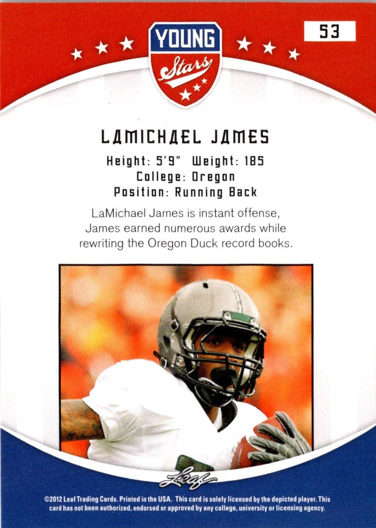 This 2012 Leaf Young Stars LaMichael James #53 Oregon Ducks card features a full-color photo of the legendary Ducks running back in his Oregon uniform. The card captures his signature running style and celebrates his stellar college career. This card is a great addition to any Oregon Ducks fan's collection, and a must-have for any LaMichael James fan! Add this card to your collection today and celebrate one of the greatest running backs in college football history!