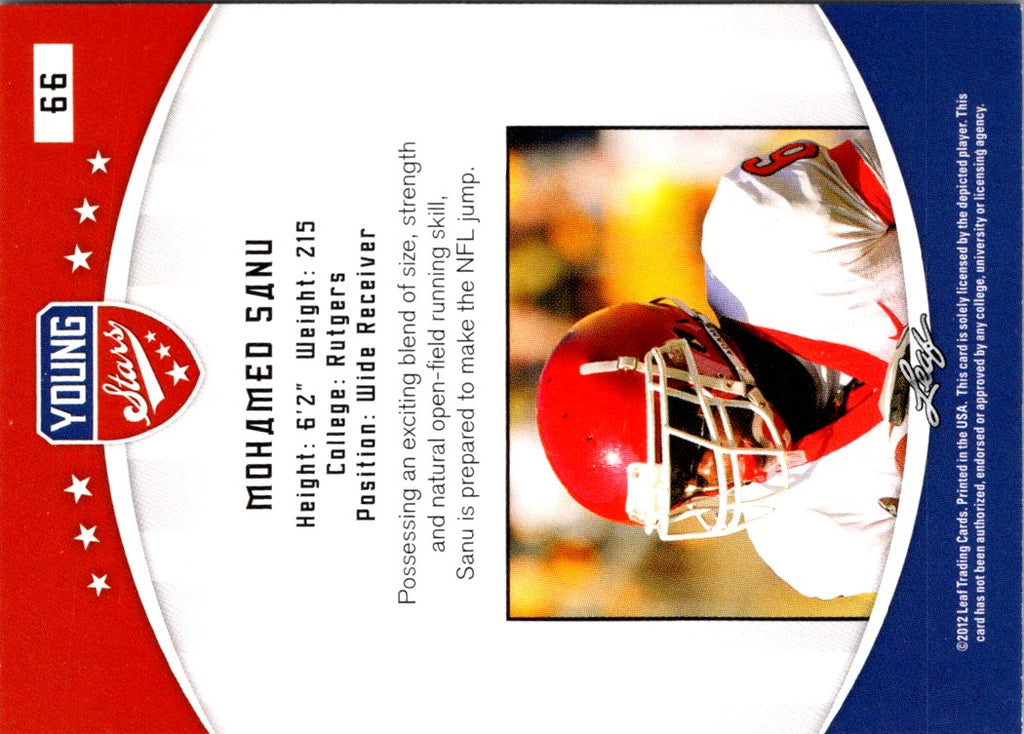 This 2012 Leaf Young Stars Mohamed Sanu #66 card from Rutgers Scarlet Knights celebrates the college star's impressive achievements. Sanu is featured in the Scarlet Knights uniform, and the card is a great way to honor this football standout. The card features an action shot of Sanu on the field, capturing his determination and drive. The back of the card also includes detailed information about Sanu's college career, his stats and other interesting facts. This card is a must-have for any Scarlet Knights fan. Show your support for Sanu with this card!
