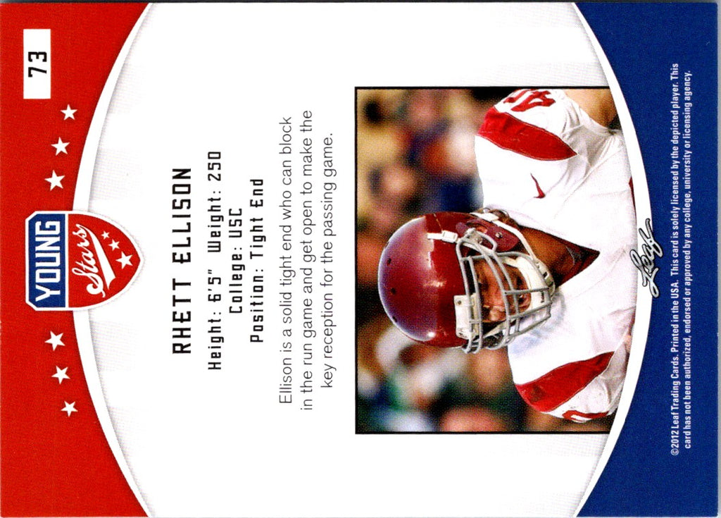 This 2012 Leaf Young Stars Rhett Ellison card features the USC Trojan alum in his iconic red and yellow school colors. His card is an ideal addition to any USC or NFL fan's collection. Ellison was drafted by the Vikings in the fourth round of the 2012 NFL Draft. He has since become a staple in the Vikings' offense and is known for his reliable blocking and pass-catching ability. With this card, you can own a piece of USC and NFL history. Add it to your collection today!