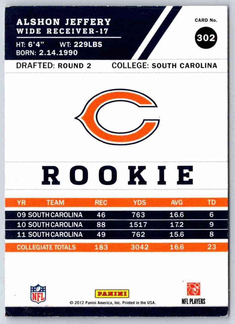 This 2012 Score Alshon Jeffery #302 trading card features the Chicago Bears wide receiver in all his glory. Showcasing Jeffery's dynamic athleticism, this card is a must-have for any Bears fan. The card's vivid colors and high-quality photography make it a great addition to any collection. With stats and a biography of Jeffery on the reverse side, this card is sure to become a treasured keepsake. Whether you're a Bears fan or a collector of great NFL memorabilia, this card is a must-have.