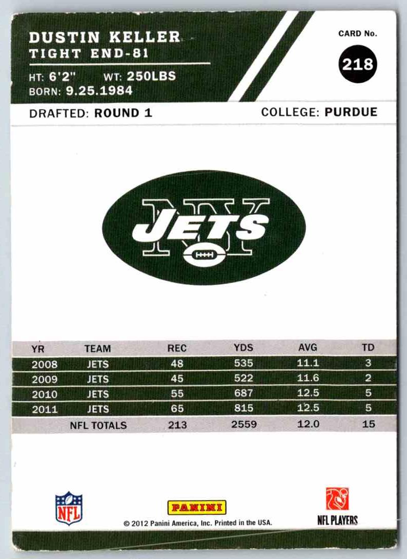 This 2012 Score Dustin Keller card #218 is a must-have for any serious football fan. Featuring a full-color image of the New York Jets tight end, this card is part of the 2012 Score Football Collection. Collectors will appreciate the card's crisp detailing and vibrant colors. It is sure to make a great addition to any sports memorabilia collection.