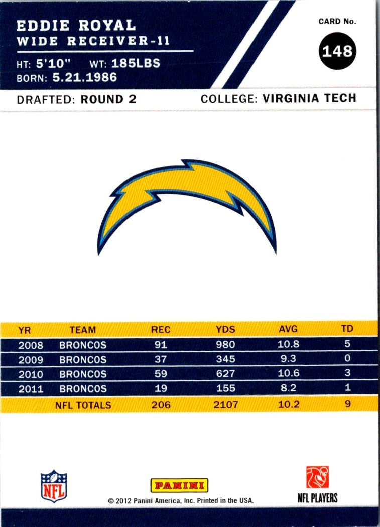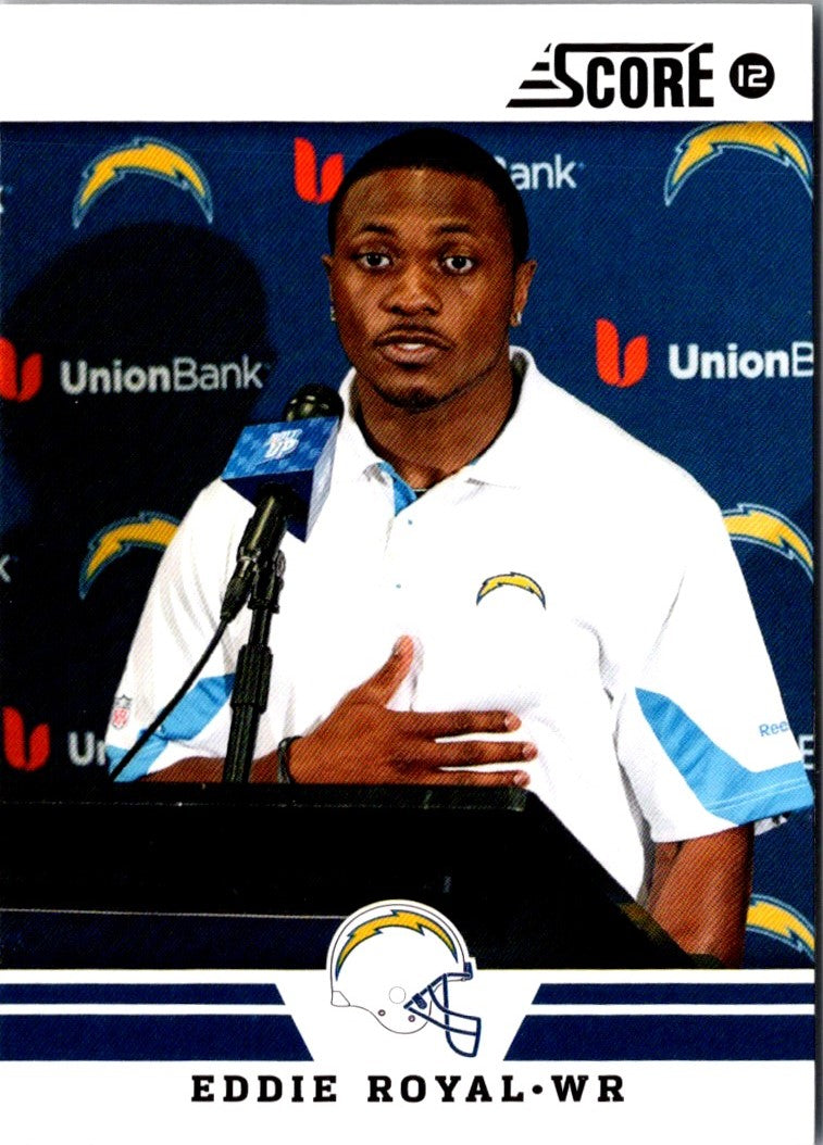 This 2012 Score Eddie Royal #148 San Diego Chargers card is an absolute must-have for any football fan's collection. Featuring a sharp image of Royal in his blue and yellow Chargers jersey, this card is sure to make any fan proud. With vibrant colors and a glossy finish, this card is a great way to show off your fandom. Collectors will love the fact that this card is part of a set that celebrates the career of one of the NFL's top wide receivers. Add this card to your collection today and show off your Chargers pride.