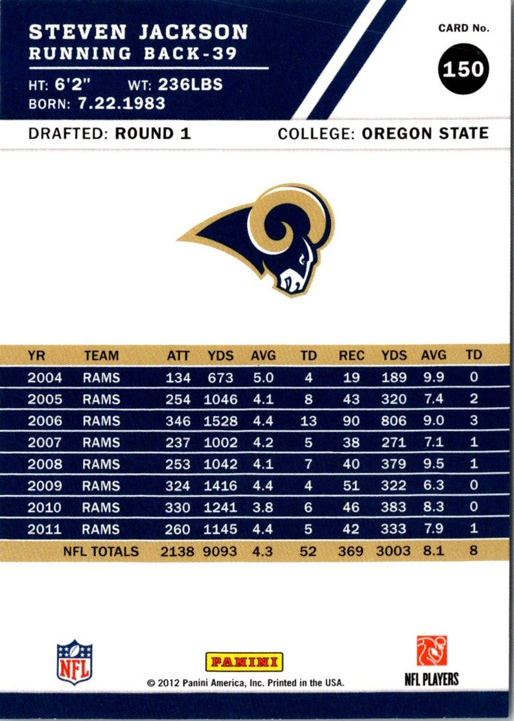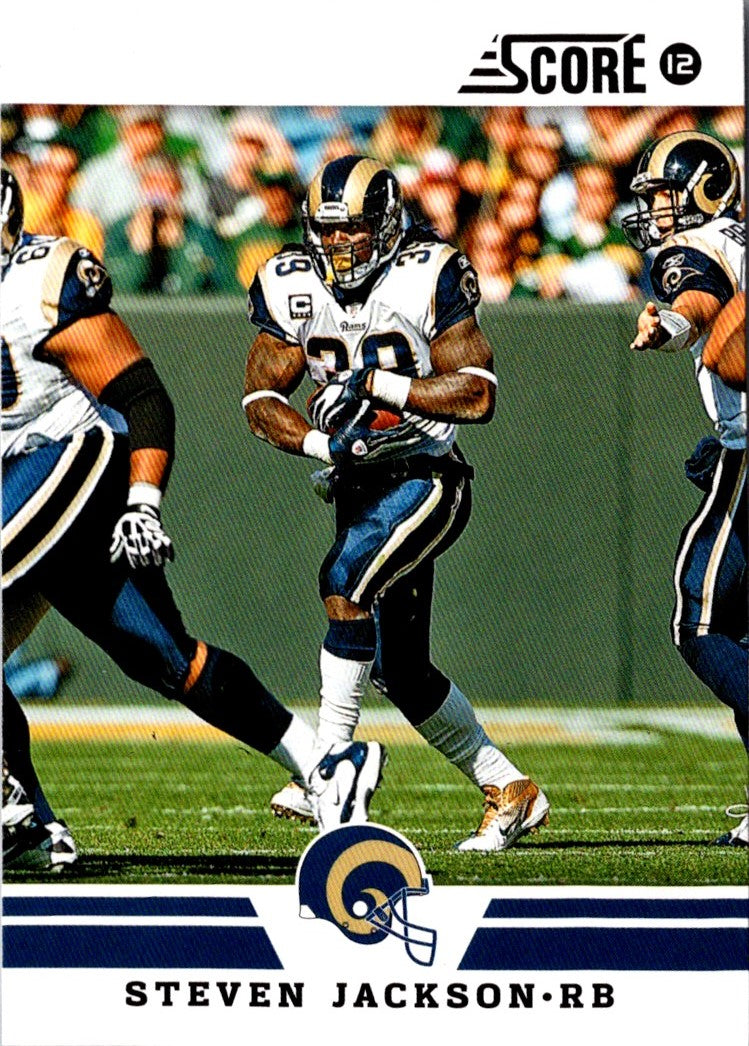 The 2012 Score Steven Jackson #150 card is the perfect addition to any St. Louis Rams fan's collection. Featuring an iconic image of Jackson in his Rams jersey, this card captures the essence of the three-time Pro Bowler and eight-time 1,000-yard rusher. Show your pride for the Rams and one of their most beloved players with this card, which is sure to become a timeless piece of memorabilia.