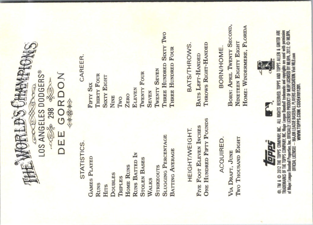 This 2012 Topps Allen & Ginter Dee Gordon #298 Los Angeles Dodgers card is an absolute must-have for any Dodgers fan. On the card, the young shortstop is featured in a classic action shot. The card also features a detailed biography of Gordon's career, including his stats from the 2012 season. With this card, you can relive the excitement of Gordon's rookie season and add it to your collection. Perfect for any Dodgers fan or card collector.