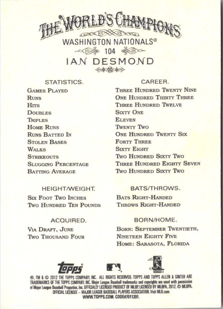 2012 Topps Allen & Ginter Ian Desmond #104
