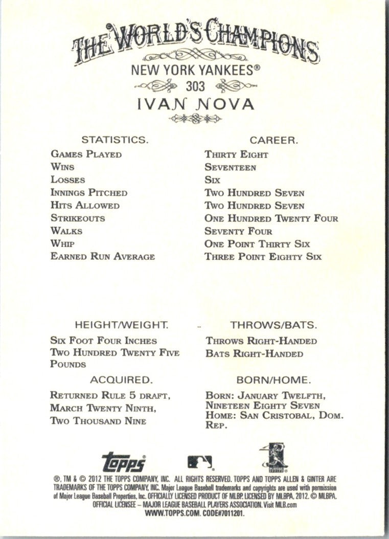 2012 Topps Allen & Ginter Ivan Nova #303 is an absolute must-have for any New York Yankees fan! Featuring a full-color image of the pitching ace in full Yankees uniform, this card captures the nostalgia of the classic baseball card. The back of the card includes a detailed profile of Nova's career highlights and accomplishments. Add this card to your collection today and show your support for one of the greatest players in Yankees history!