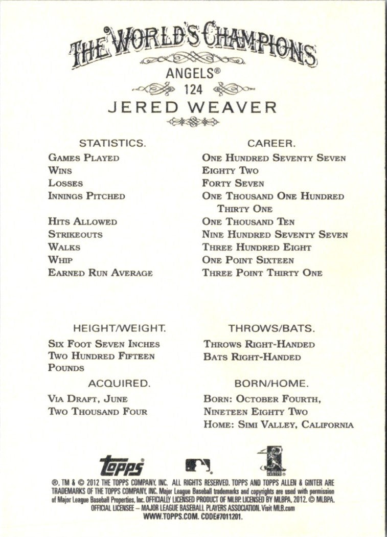 This 2012 Topps Allen & Ginter card features Jered Weaver, the right-handed pitcher for the Los Angeles Angels. Weaver is a 4-time All-Star and a 2-time American League strikeout leader. This card captures Weaver in action in his Angels jersey, and is sure to be a great addition to any fan's collection. With a glossy finish and vivid colors, this card is sure to make a great display piece. Add this card to your collection today and celebrate the career of one of the Angels' all-time greats.