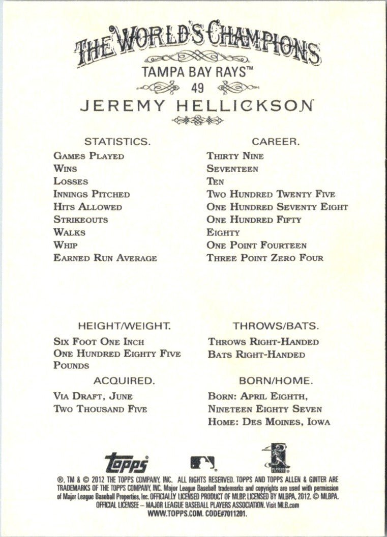 This 2012 Topps Allen & Ginter Jeremy Hellickson #49Tampa Bay Rays card is sure to be the pride of any Rays fan's collection! Featuring the 2012 American League Rookie of the Year, this card captures Hellickson in a mid-pitch pose in his classic Rays uniform. The card's reverse side features an in-depth profile of the young star, as well as his career stats and awards. Add this amazing card to your collection today and show your Rays pride!
