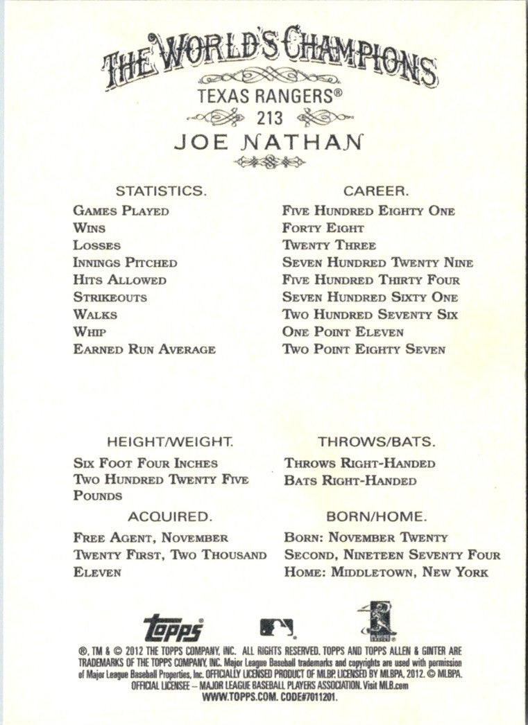 This 2012 Topps Allen & Ginter Joe Nathan #213 Texas Rangers card features a full-color, high-resolution image of the legendary baseball player in action! The card is printed on a glossy and sturdy cardstock, making it perfect for collecting or trading. The back of the card contains a brief biography of Joe Nathan and his career stats. Whether you're a fan of the Rangers, Joe Nathan, or just baseball cards in general, this card is sure to be a great addition to any collection.