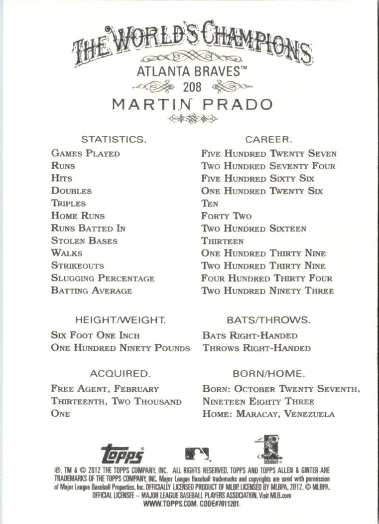 This 2012 Topps Allen & Ginter Martin Prado #208 card is a must-have for any fan of the Atlanta Braves! Featuring a detailed, full-color image of Prado in his Braves uniform, this card is sure to be a treasured part of any Braves fan's collection. It's a great way to honor the long-time Braves favorite and his accomplishments with the team. Get yours today and show your team pride!