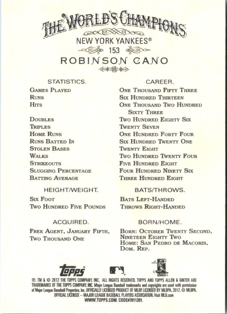 Description: 2012 Topps Allen & Ginter Robinson Cano #153