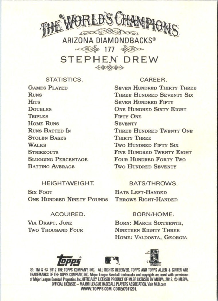 Card #177 from the 2012 Topps Allen & Ginter Baseball Set features Stephen Drew of the Arizona Diamondbacks. This card is a must-have for any Diamondbacks fan, highlighting the team's former shortstop in a beautiful, full-color illustration. It's a great addition to any collection and the perfect way to show your team pride. With this card, you'll be able to show your support of the Diamondbacks, even when they're not playing.