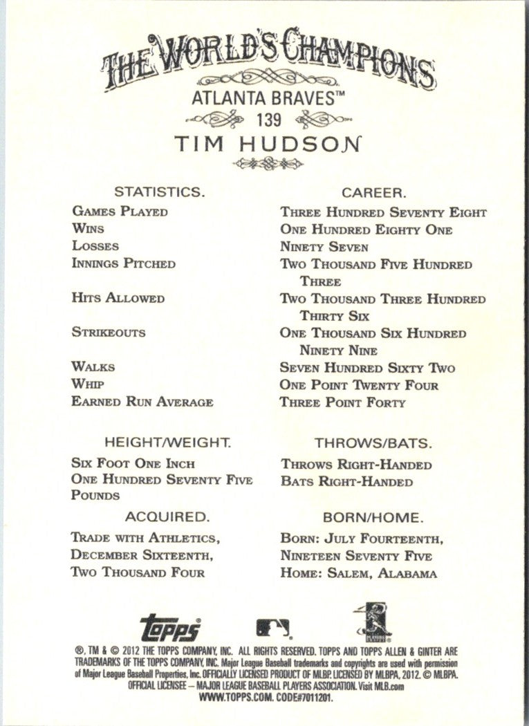 This 2012 Topps Allen & Ginter card of Tim Hudson of the Atlanta Braves is a must-have for any serious baseball card collector. This card features a brilliant photo of Hudson in his Braves uniform, and his name and team logo on the front. The back has a detailed biography of the long-time Braves pitcher, along with stats and highlights from his career. This card is a great addition to any collection and a great way to honor one of the most successful and beloved Braves of all time.
