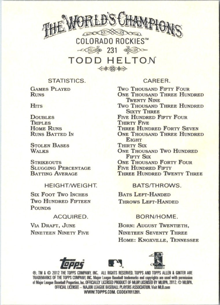 This 2012 Topps Allen & Ginter Todd Helton #231 Colorado Rockies card is a must-have for any Rockies fan. Featuring a portrait of Helton in classic batting pose, this card captures the essence of the beloved Rockies star. The card is printed on durable cardboard stock and features a colorful background with accents of Rockies colors. This card is sure to make a great addition to any collection.