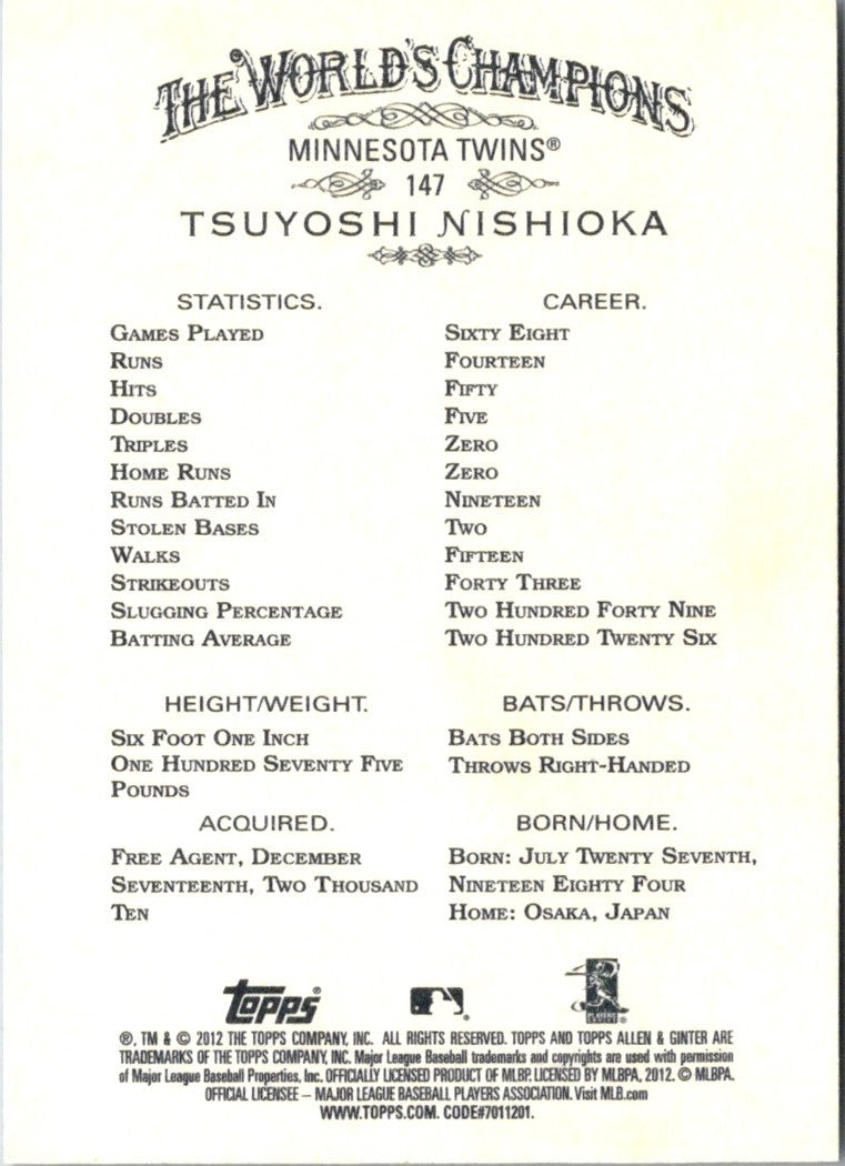 2012 Topps Allen & Ginter Tsuyoshi Nishioka #147